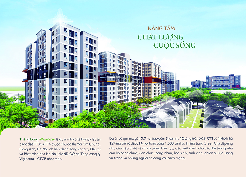 Với tâm huyết xây nhà ở xã hội có chất lượng và tiện ích tương đương nhà ở thương mại, dự án nhà ở xã hội Kim Chung được Liên danh chủ đầu tư đặt tên Thăng Long Green City, nhằm hướng tới một khu đô thị xanh, một không gian sống lý tưởng cho người dân với các tiện ích được đầu tư đồng bộ như: công viên cây xanh, nhà sinh hoạt cộng đồng, đường dạo, tiểu cảnh, đài phun nước…, tạo nên một khu đô thị hoàn chỉnh, điểm nhấn về kiến trúc cảnh quan trên địa bàn huyện Đông Anh nói riêng và thành phố Hà Nội nói chung.