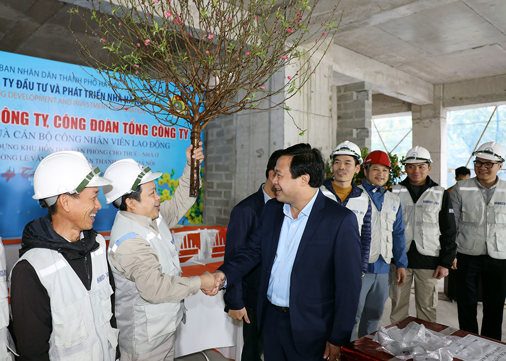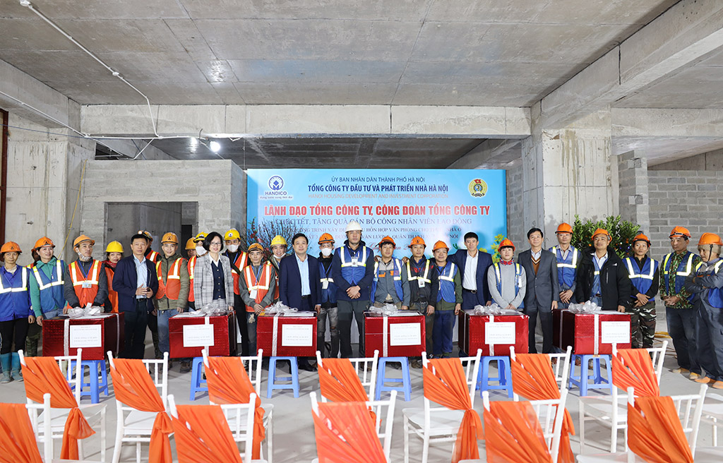(HANDICO) - Nhân dịp Xuân mới Giáp Thìn 2024, Lãnh đạo Tổng công ty Đầu tư và Phát triển nhà Hà Nội (HANDICO) và Công đoàn Tổng công ty đã đến tặng quà, chúc Tết cán bộ, công nhân viên, người lao động đang làm việc tại công trường thi công Dự án Khu hỗn hợp Văn phòng cho thuê và Nhà ở tại ô đất 3.10 Lê Văn Lương, Thanh Xuân, Hà Nội (giai đoạn 2).