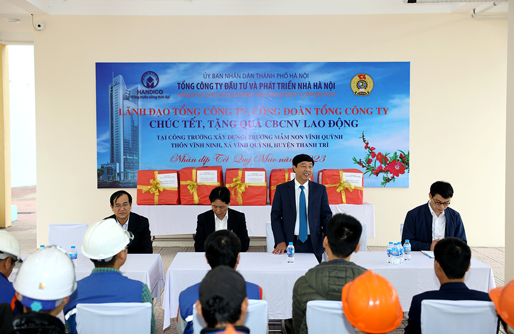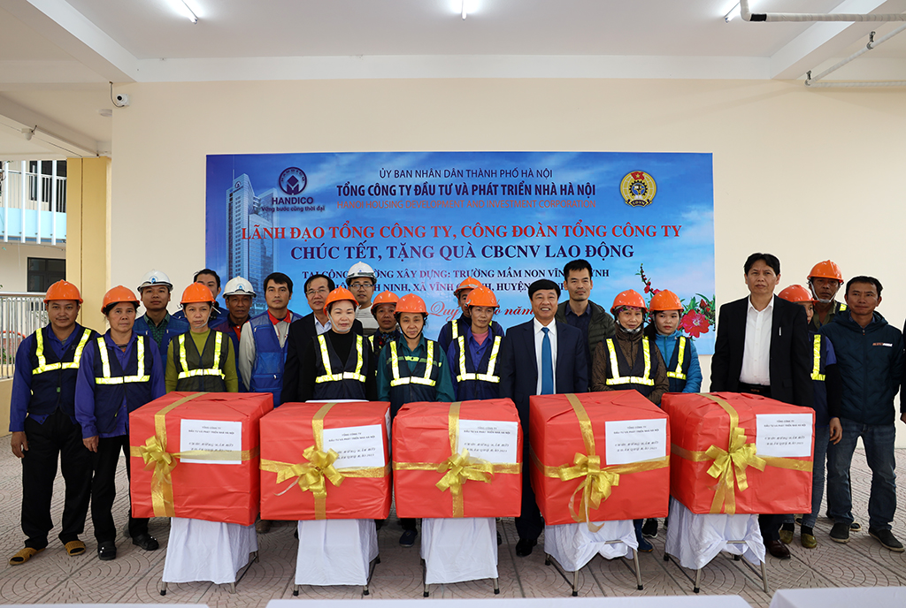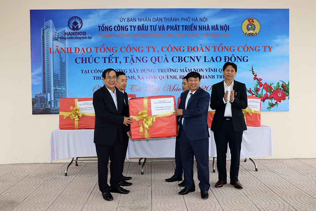 (HANDICO) - Nhân dịp Xuân mới Quý Mão 2023, Lãnh đạo Tổng công ty Đầu tư và Phát triển nhà Hà Nội (HANDICO) và Công đoàn Tổng công ty đã đến tặng quà, chúc Tết cán bộ, công nhân viên, người lao động đang làm việc tại công trường thi công Trường mầm non Vĩnh Quỳnh, Thanh Trì, Hà Nội.