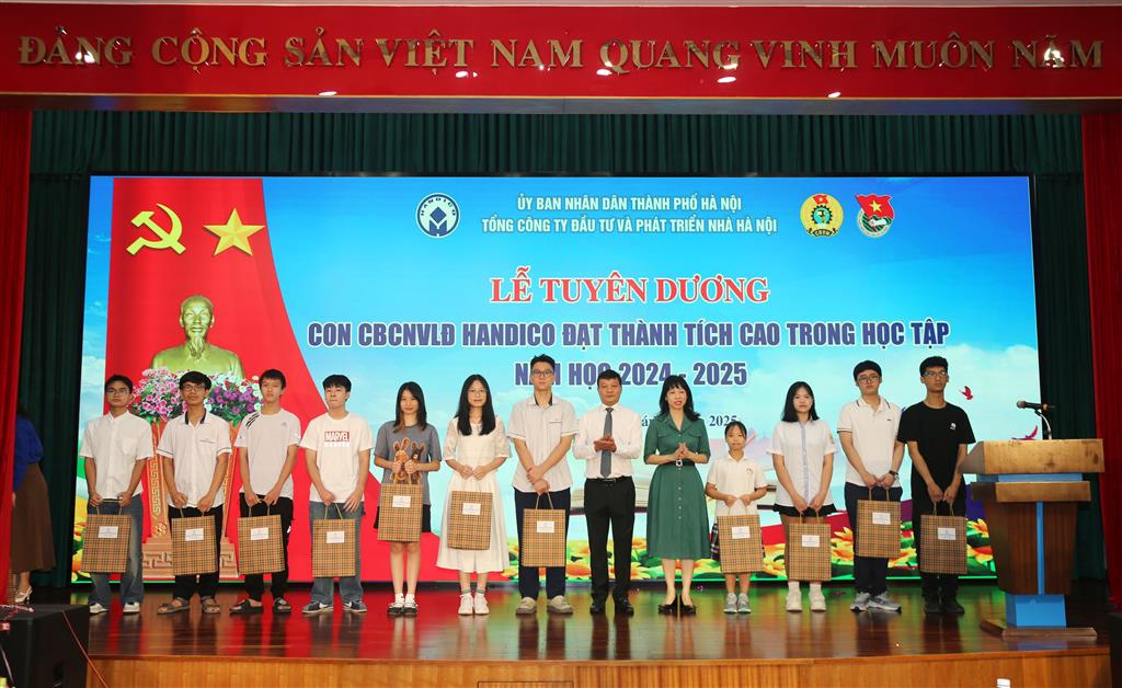 Đồng chí Nguyễn Ngọc Huyền - Phó Chủ tịch Công đoàn Xây dựng Việt Nam và đồng chí Trương Hải Long - Bí thư Đảng ủy, Chủ tịch Hội đồng thành viên HANDICO tặng quà cho các em học sinh đạt thành tích cao trong các kỳ thi học sinh giỏi các môn văn hóa và Khoa học, Cuộc thi khoa học kỹ thuật, Cuộc thi “Học sinh, sinh viên với ý tưởng khởi nghiệp” cấp quốc gia